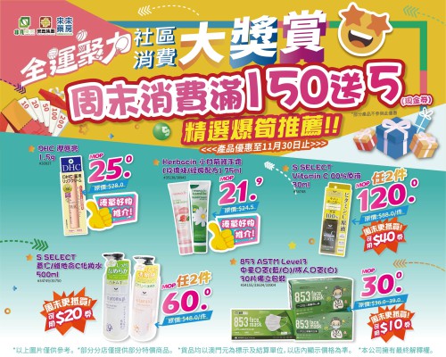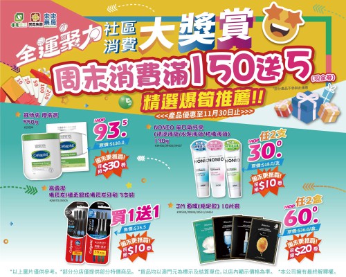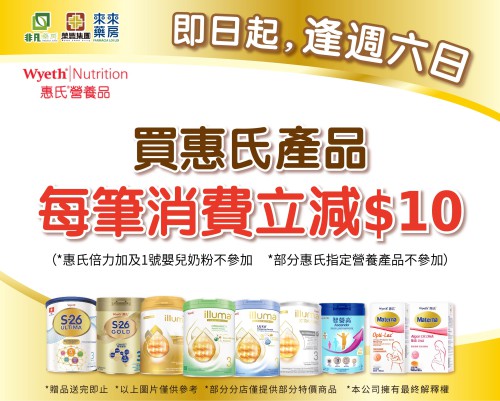 【周末消費優惠】買滿$150即送$5(現金代用券)★【惠氏Wyeth】有優惠啦★11月份,每個周六、日,每筆消費立減$10 !指定奶粉系列及健康食品系列都參與*惠氏倍力加及1段奶粉均不參加此立減活動。*部分惠氏指定營養產品不參加此立減活動。★全線P&G產品限時立減活動★買滿$150即減$15買滿$300即減$35非凡集團全線分店,周六、日皆可核銷優惠券‼精明嘅您,記得嚟囤貨啦!