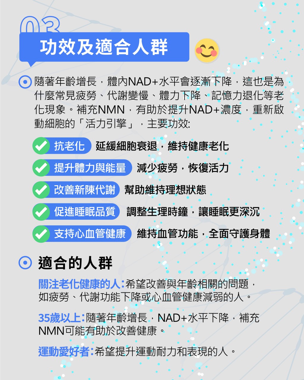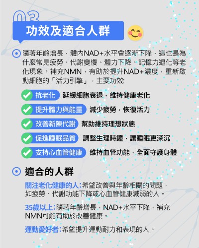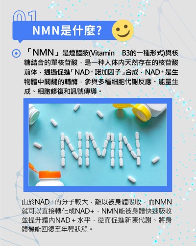 「NMN」被視為能延緩細胞衰老的「逆齡神物」,因其能提升體內關鍵的「能量貨幣」NAD+水平,但NMN有效嗎?什麼人適合補充?今期一篇帶您認識「NMN」~快來點開大圖閱讀啦!