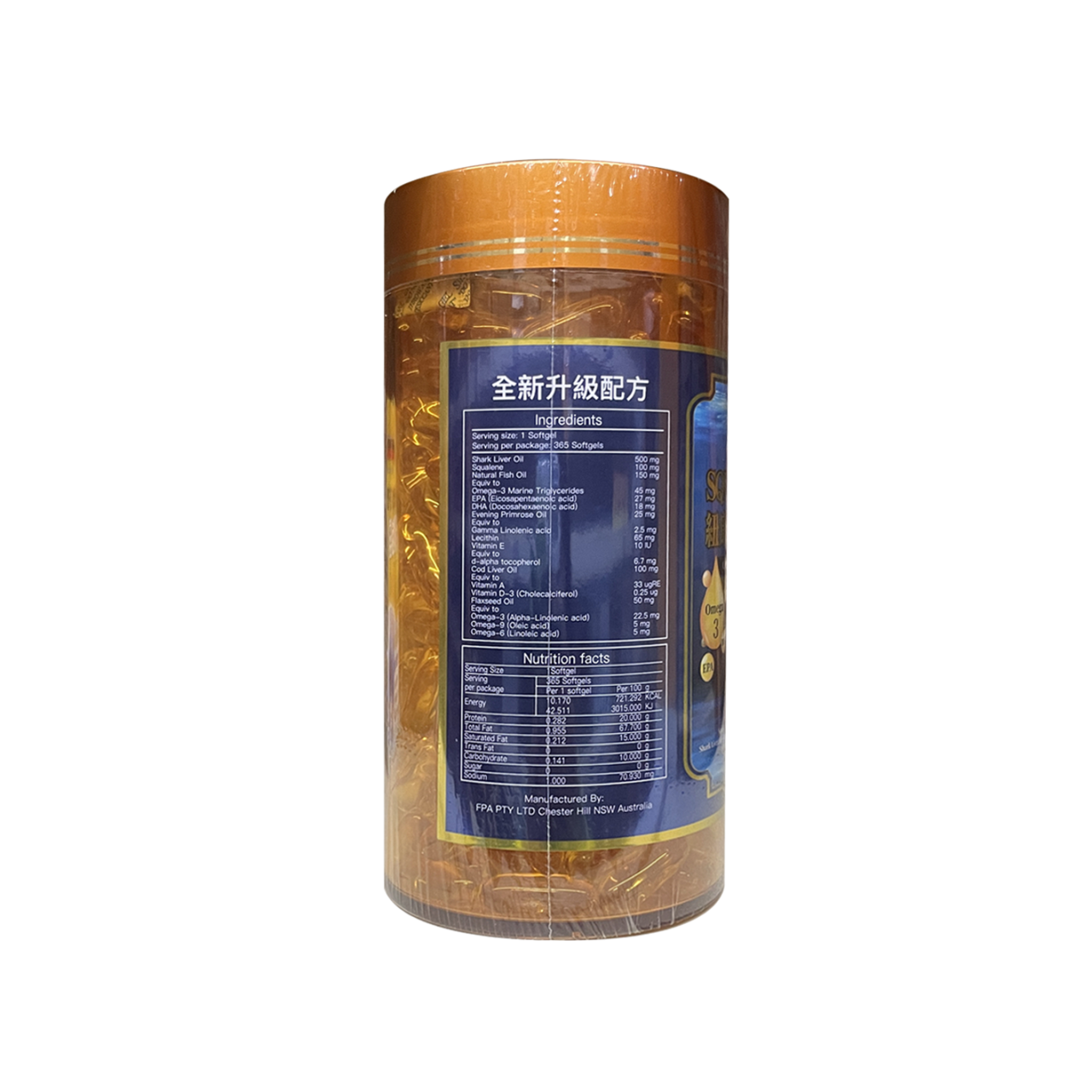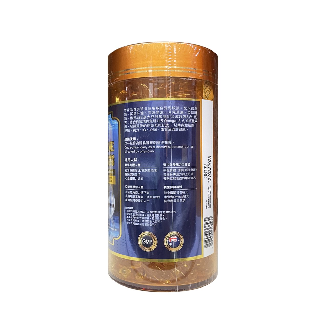 本產品含有珍貴鯊烯取自深海鮫鯊,配以鱈魚 油、鯊魚肝油、深海魚油、月見草油、亞麻籽 油、維他命E及大豆卵磷脂組合成超強8合1配 方;結合自鯊烯與魚肝油及Omega-3, 6, 9相互效 應,發揮最佳的保護及抵抗力、幫助身體細胞、 肝臟、視力、IQ、心臟、血管及皮膚健康。